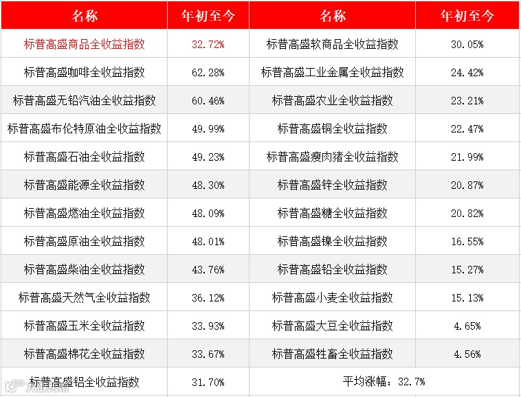 从全球范围看,截至12月20日,追踪24个交易所挂牌商品期货合约的标普高盛商品指数上涨32.7%。原油、有色相关指数表现突出,农产品类指数也不俗。