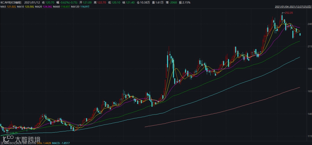 12月初,美国洲际交易所咖啡期货价格报244美分/磅,为10年来最高水平。截至目前,咖啡指数年内涨幅已达75%。