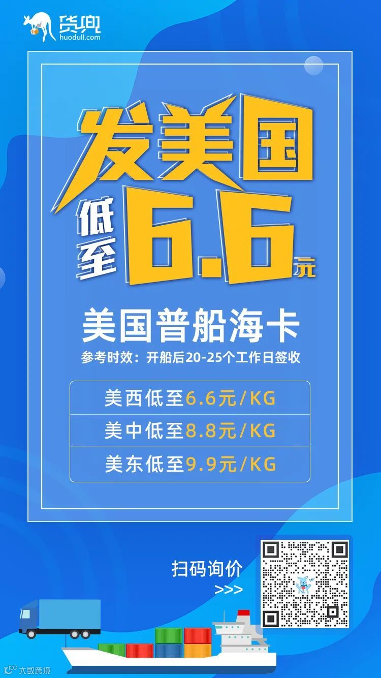 本周货兜推出美国普船海卡,价格低至6.6元/kg,需要发货的卖家可以参考下,欢迎来询。
