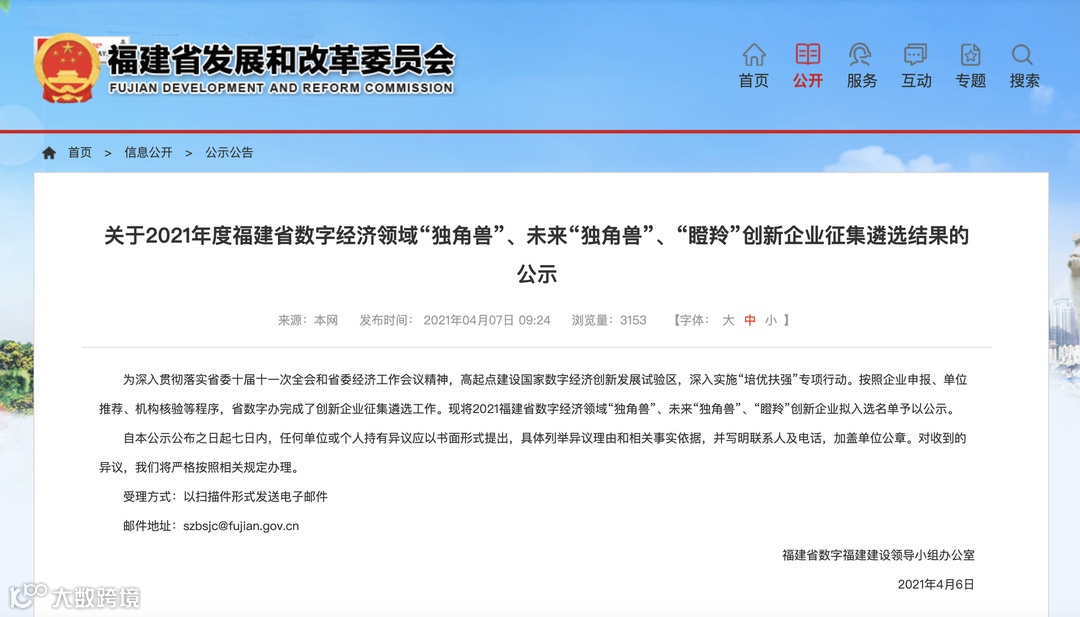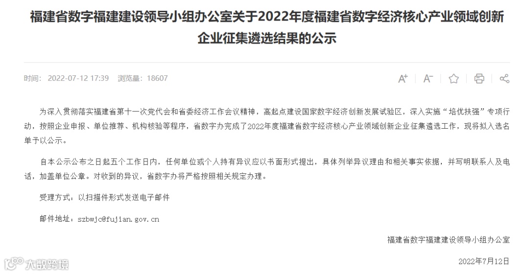 近日,福建省数字福建建设领导小组办公室发布了《2022年度福建省数字经济核心产业领域创新企业征集遴选结果的公示》,本次共有316家企业入选。