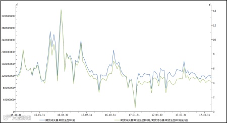从全市场成交及持仓情况来看,期货市场成交量继续下降,持仓量保持稳定,成交持仓比回落。