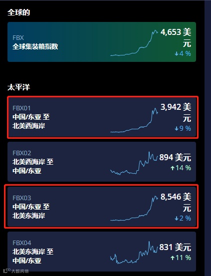 据FBX运价指数数据,亚洲至美西航线运价也创较大跌幅,较前一周下降9%,至3942美元/FEU;美东航线运价下降2%,至8546美元/FEU。