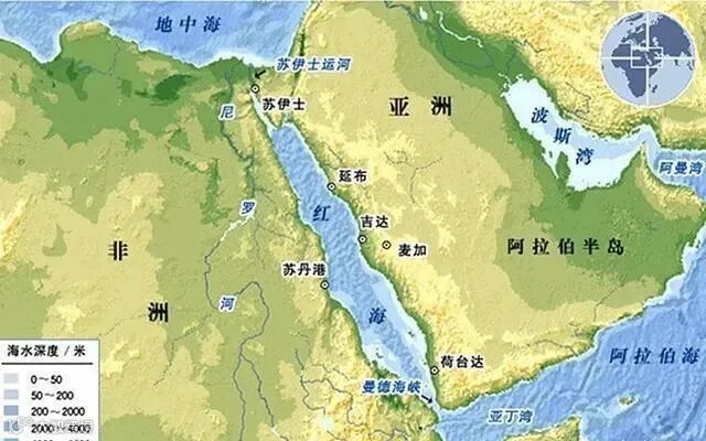 苏伊士运河至红海这一国际航运要道,扼守亚、非、欧三洲交通要道,连通红海与地中海,是世界上最繁忙的水道之一。