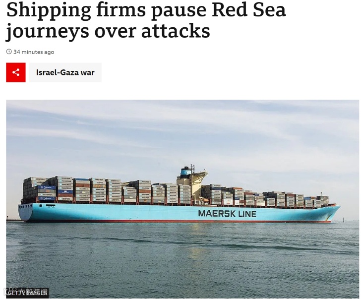 ▲马士基暂停所有途经红海航线(BBC报道)