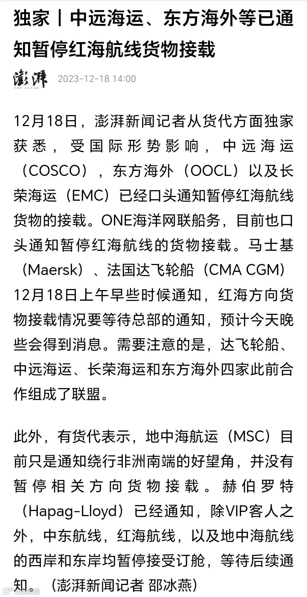 12月15日-16日马士基、赫伯罗特、达飞海运集团、地中海航运等航运巨头陆续发布声明,暂停其所有经红海的集装箱运输,紧接着,12月18日,中远、长荣、ONE和东方海外全部暂停红海航线订舱操作,直至另行通知。