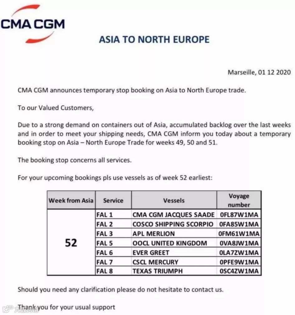 达飞 CMA CGM通知,暂时停止接收亚洲发往北欧新的订舱,时间暂定停止3周:49、50和51。