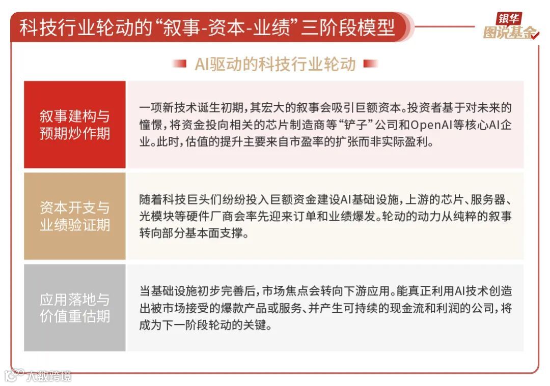 6、科技行业的轮动,本质上是由颠覆性技术的出现和其商业化进程驱动的。当一项新技术展现出变革潜力时,资本市场会经历一个典型的“叙事-资本-业绩”的传导周期。