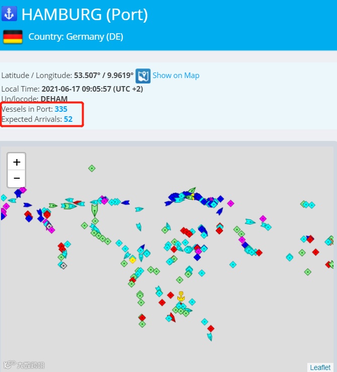 汉堡港已抵港船只:335艘,即将抵港船只:52艘