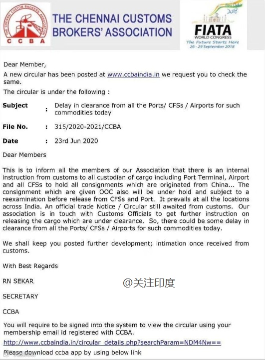 6月23日,印度钦奈港口报关代理人协会(CCBA),向所有成员发布了内部清关延迟的通知,要求对所有来自中国的货物,暂停清关工作。已经完成清关的货物,需要重新进行检查,至于是否涉及所有印度港口和口岸,有待商榷。