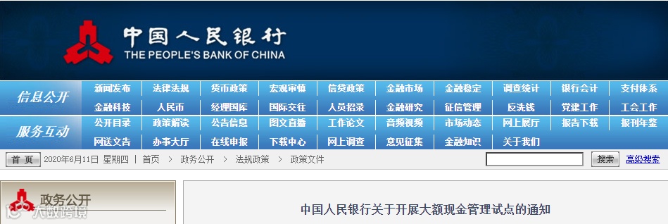 中国人民银行新近发布的《中国人民银行关于开展大额现金管理试点的通知》(全文附后),决定自2020年7月起,在河北省、浙江省和深圳市开展大额现金管理试点: