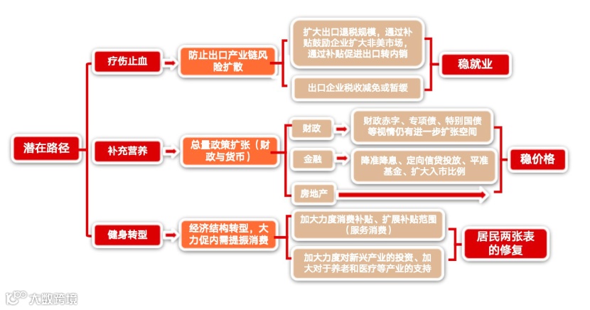 因此,在国内侧,政策或更多“以我为主”,回到今年早些时候提到的“必要时推出超常规逆周期政策”的主线上来。而潜在的政策路径,我们也在之前几期月报中分析过,依旧可以沿着防止出口产业链风险扩散(稳就业)、增量政策扩张(稳价格)和经济结构转型、大力促内需提振消费(居民两张表的修复)这三条路径进行。