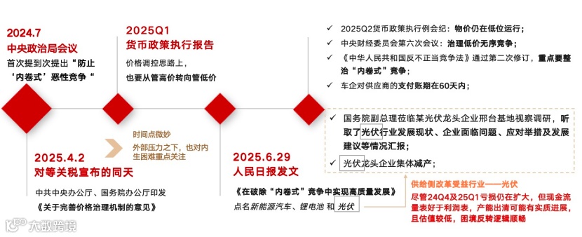 许多市场参与者也在近期才发觉价格反内卷的政策加码,而这一轮“反内卷”的浪潮,在更早的时点就已经展开。2025年4月2日,中共中央办公厅、国务院办公厅印发了《关于完善价格治理机制的意见》,再到后续2025年央行一季度货币政策执行报告、《人民日报》等一系列文章、官方文件和重要会议都对于“价格治理”都进行了相关的表述。