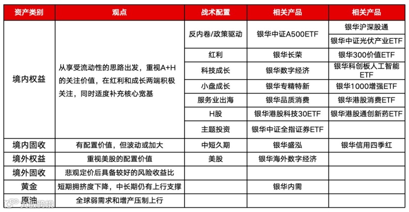 我们建议可以考虑关注代表更广泛A股核心资产的A500等大盘龙头宽基,同时关注受益于流动性逻辑、对总量经济特别传统经济低相关性的板块、EPS稳定的红利股、科技成长股、小盘成长股、服务业出海等,另外可以考虑通过关注券商应对流动性上行风险,恒生科技应对关键会议上行风险。具体行业侧,我们整体对于光伏、券商、钢铁等板块预期较好。