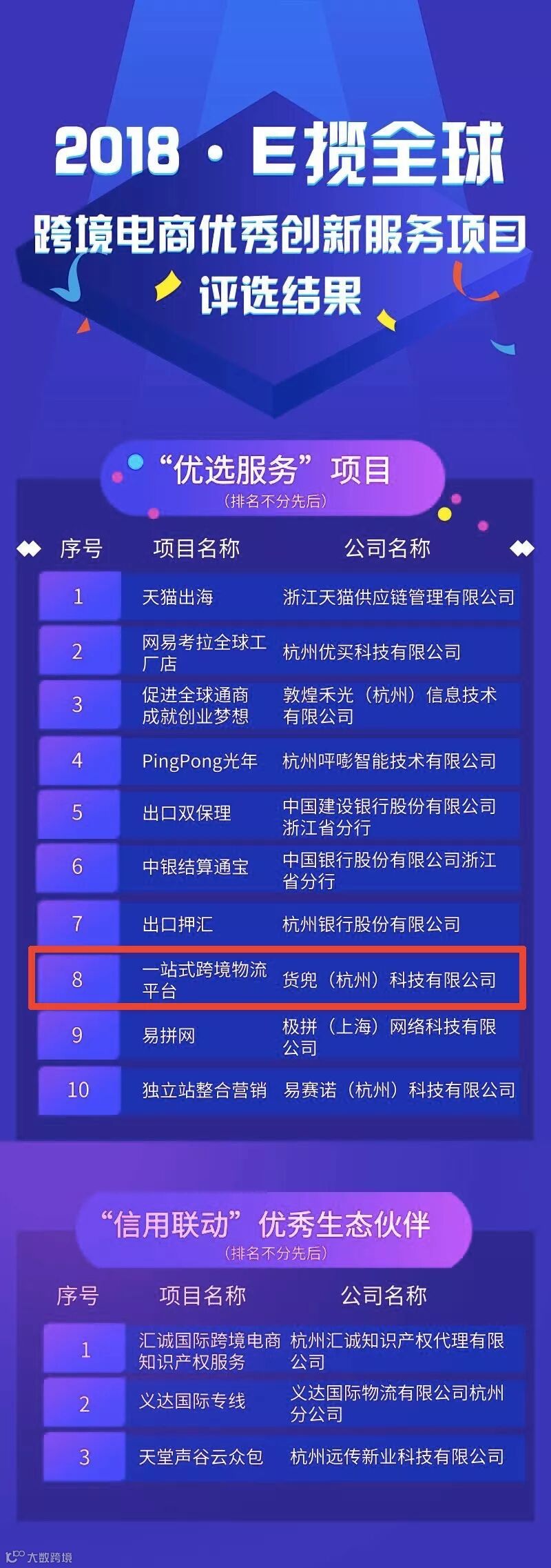 e-Box平台于2019年初展开“2018年跨境电商优秀创新服务项目评选”,从多维度评选出10家“优选服务”项目和3家“信用联动”优秀生态伙伴。货兜以出色的表现力从百家企业中脱颖而出,荣获“2018E揽全球跨境电商优秀创新服务项目”。