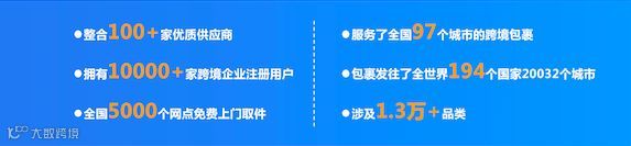 目前平台已整合100+家优质供应商,有10000+家跨境企业用户,全国5000个网点免费上门取件。2017年平台服务了全国97个城市的跨境包裹,发往全世界194个国家20032个城市,涉及品类1.3万+。