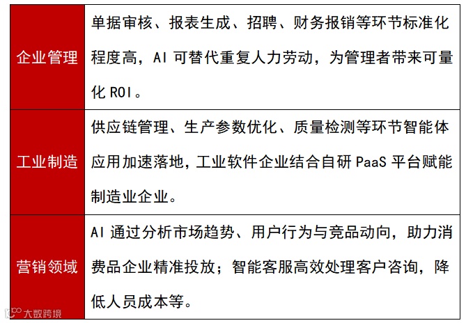 在B端,AI应用落地节奏更快的领域集中在企业管理、工业制造与营销领域,并在金融、能源、法律、自然资源等行业逐步落地。