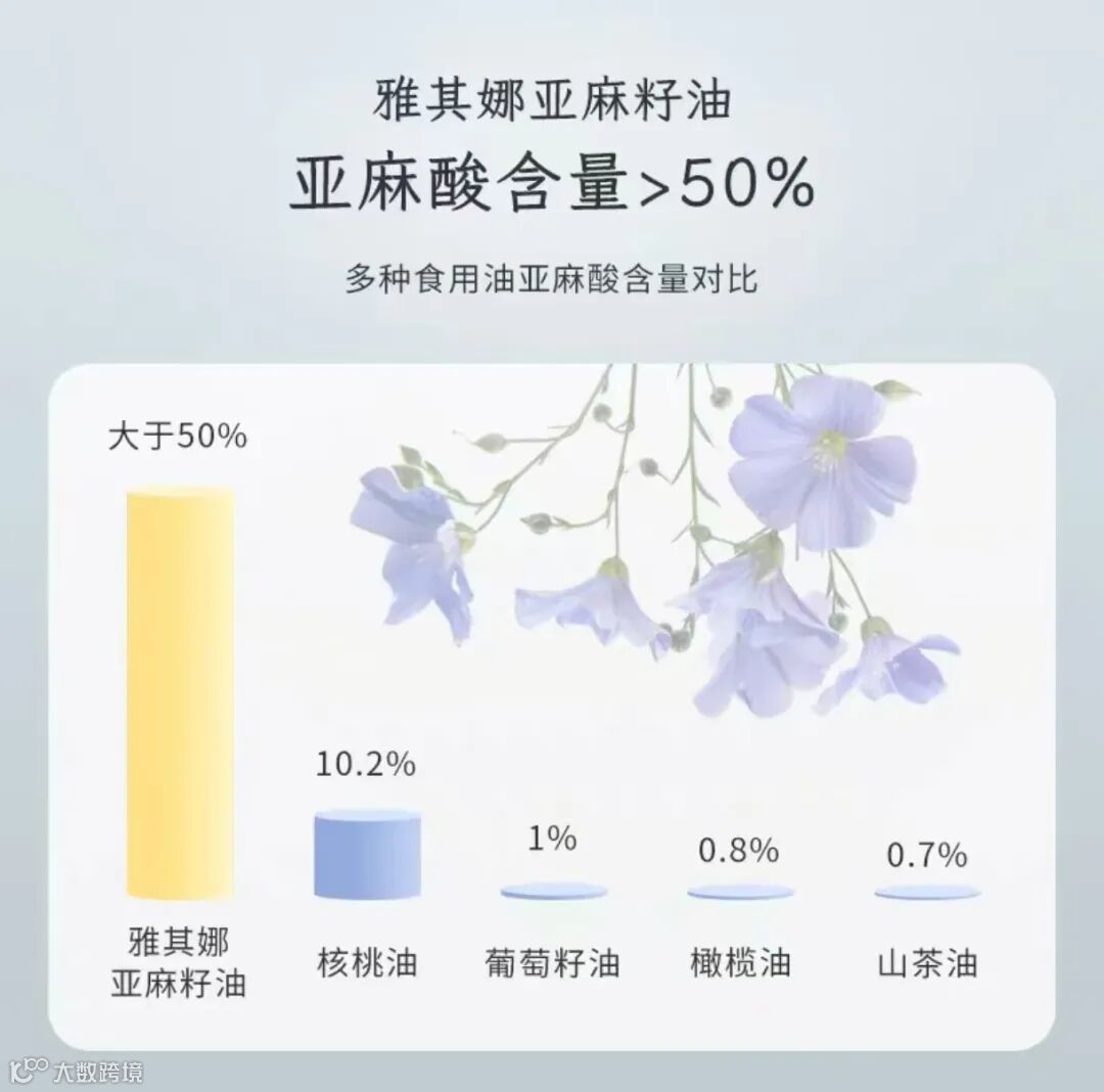 Omega-3 脂肪酸,而雅其娜亚麻籽油的亚麻酸含量令人惊叹。与市面上常见的食用油相比,它的优势一目了然: