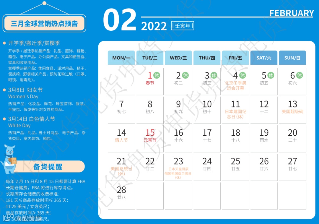 2月进入中国春节假期,所有生产商、服务商、货运都进入节前收尾阶段,建议卖家提前备好货物,最好在春节前发出。