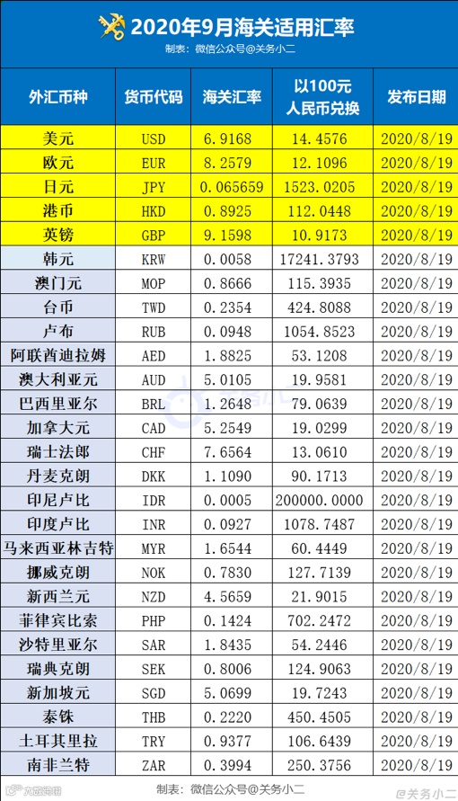 以下为2020年9月海关汇率,方便大家进行9月份的进出口贸易成本核算。