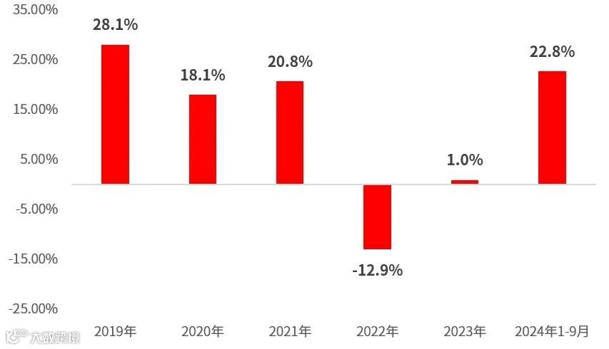 且2019-2023年这5年里,该指数年度正收益的次数达4次。