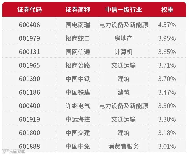 其中前五大权重行业为:建筑(12.6%)、电力设备及新能源(11.9%)、交通运输(11.7%)、电力及公用事业(11.6%)和通信(11.2%)行业。