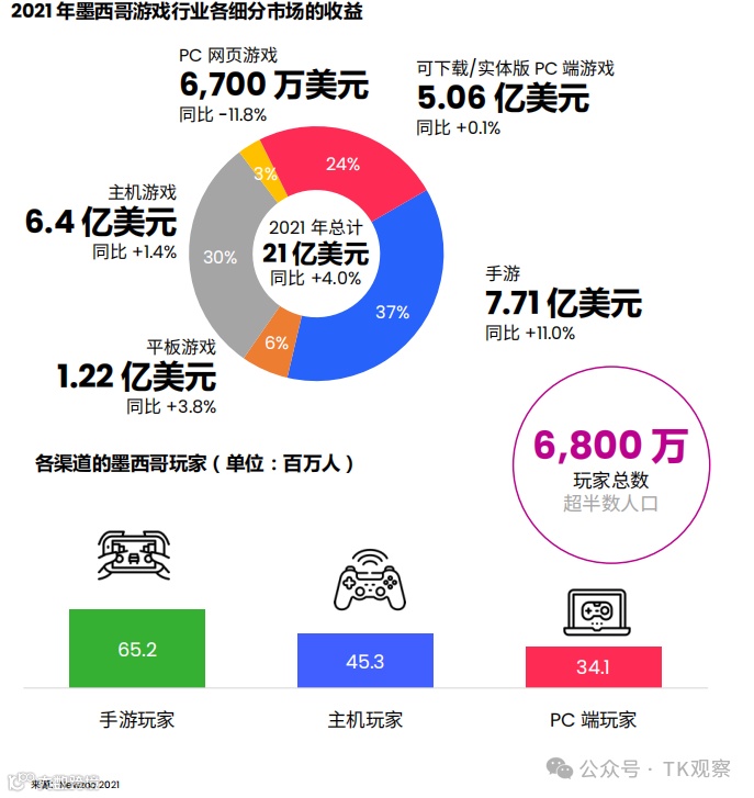 不光是电商,还有游戏,年轻人爱玩游戏,墨西哥又是拉美第二大的游戏市场。一份Newzoo2021的报告显示,超过半数的人口是游戏玩家,其中手游的占比最高。