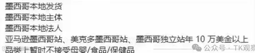 相关消息称,墨西哥站点的初步招商要求是:墨西哥本地发货,本地主体,本地法人,要求亚马逊墨西哥站、美客多墨西哥站、墨西哥独立站年10万美金以上即可,品类上暂不接受母婴/食品/保健品。条件相对还是比较宽松的。