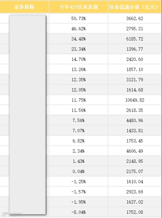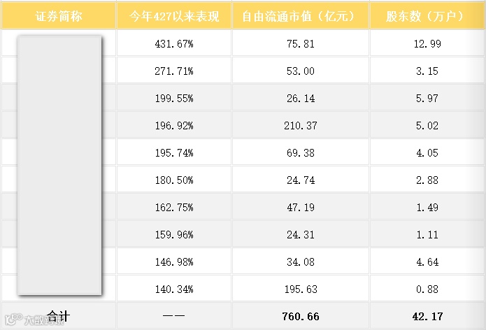 今年427以来涨幅最大的10只股票,其加总的自由流通市值仅为760.66亿元,还不到自由流通市值最大的某酒类股票的1/10,也仅占整个A股自由流通市值的0.2%。