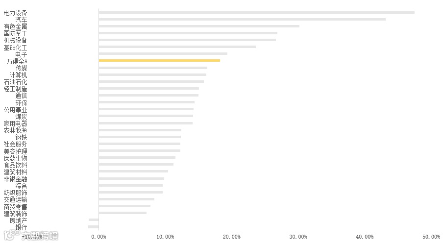 统计期间表现最好的电力设备行业指数(+47.5%)与表现最差的银行指数(-1.56%),相差近50个百分点。