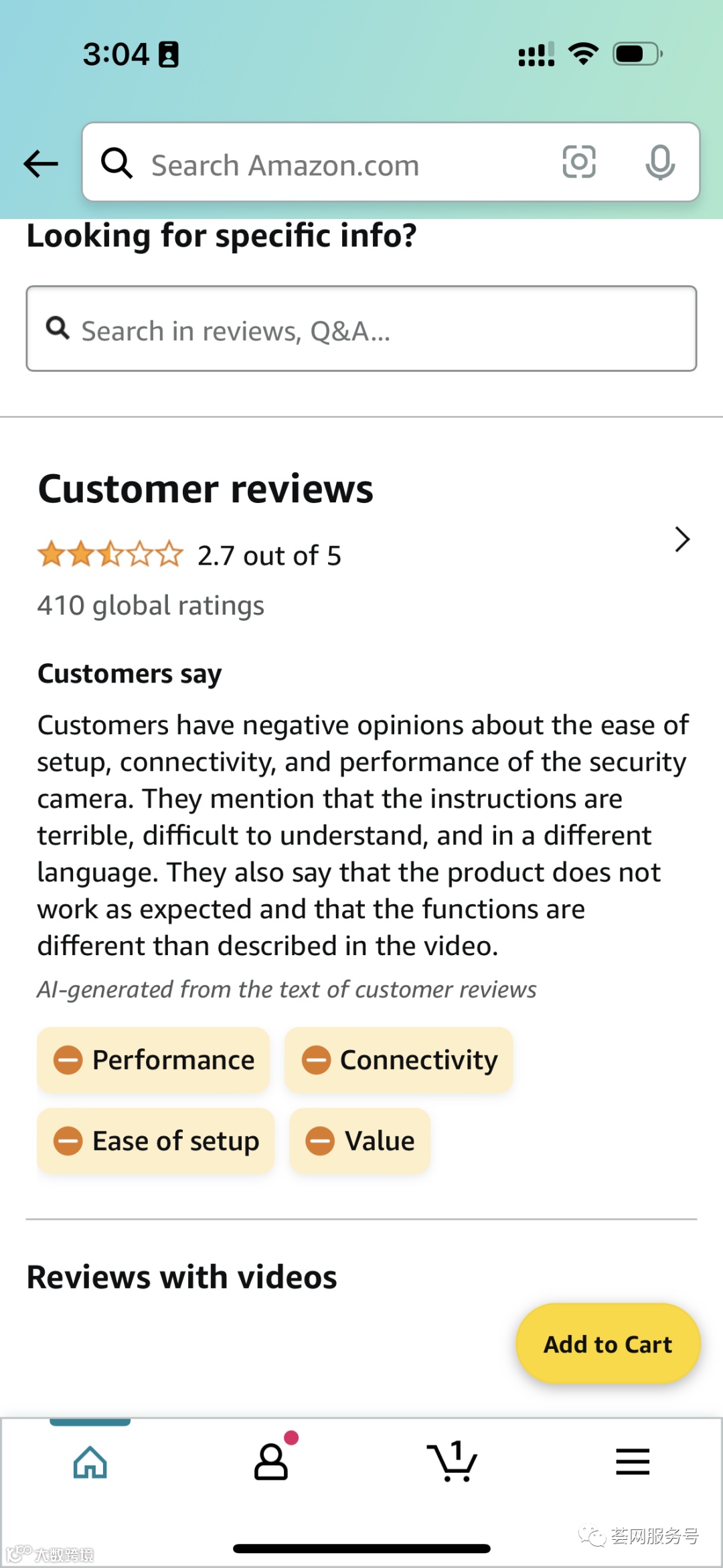 但是,如果大家点击进入到商品页面里面,并查看第一条文字评价的内容,就可以看到,这条评价不再是点赞数最高的评价,而是一条由AI总结的评价,文字下方还有亚马逊的AI对于商品卖点是否推荐的+、-符号标记。