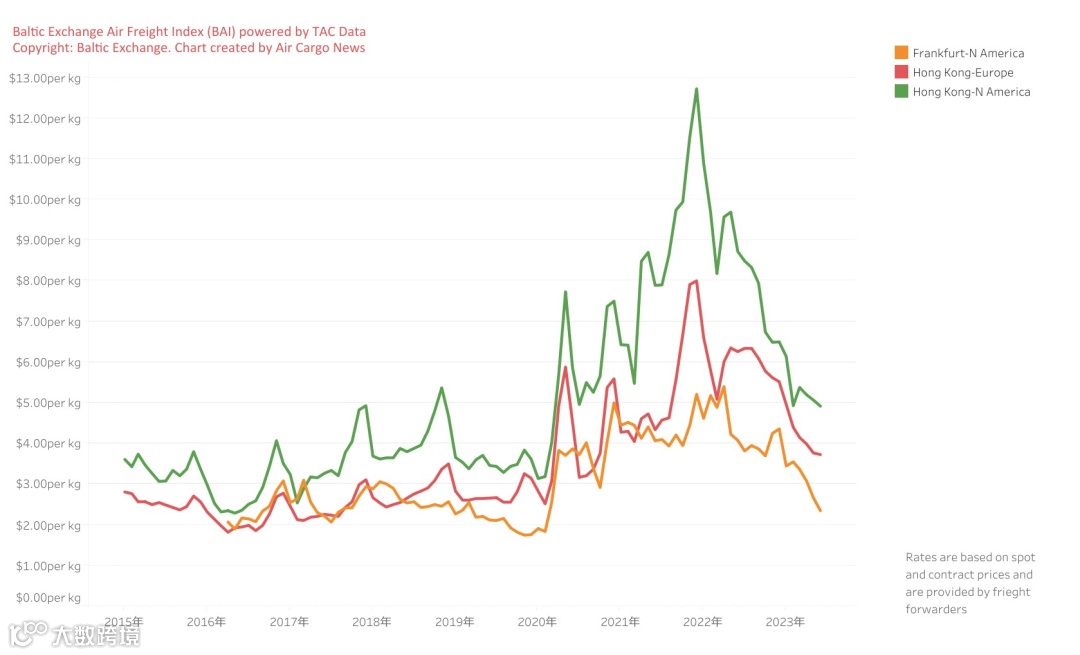根据波罗的海交易所空运指数(BAI)的数据,从香港到北美航线的平均费率从5月份的每公斤5.07美元下滑至4.92美元,与去年相比下降了43.6%。