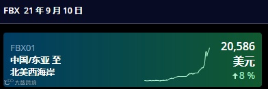 根据全球集装箱货运指数显示,截至12日,中国/东南亚-北美西海岸和中国/东南亚-北美东海岸的海运价格继续小幅上升,均突破2万美元大关:分别为20586美元/FEU和22173美元/FEU,与去年同期相比均同比上涨500%以上。
