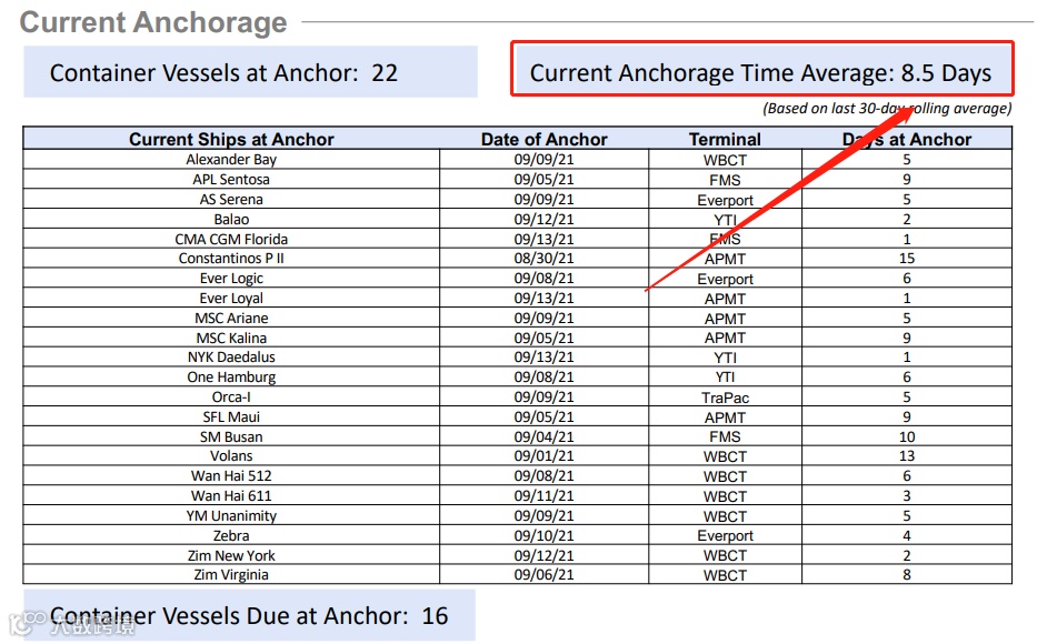 根据洛杉矶港口数据,船舶在锚地的平均等待时间长达8.5天,随着旺季货物不断到达,拥堵将会持续恶化,时效也会相应延误。
