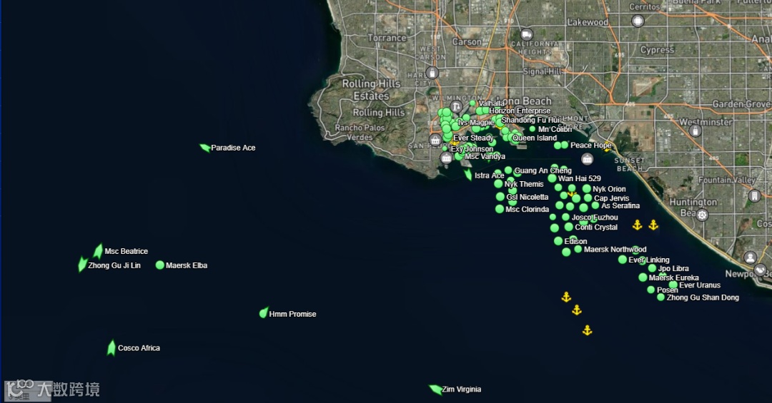 相隔一周,美西港口外的海面上又多了数十艘集装箱轮船在排队,单从图片来看,似乎没有任何消减的迹象。