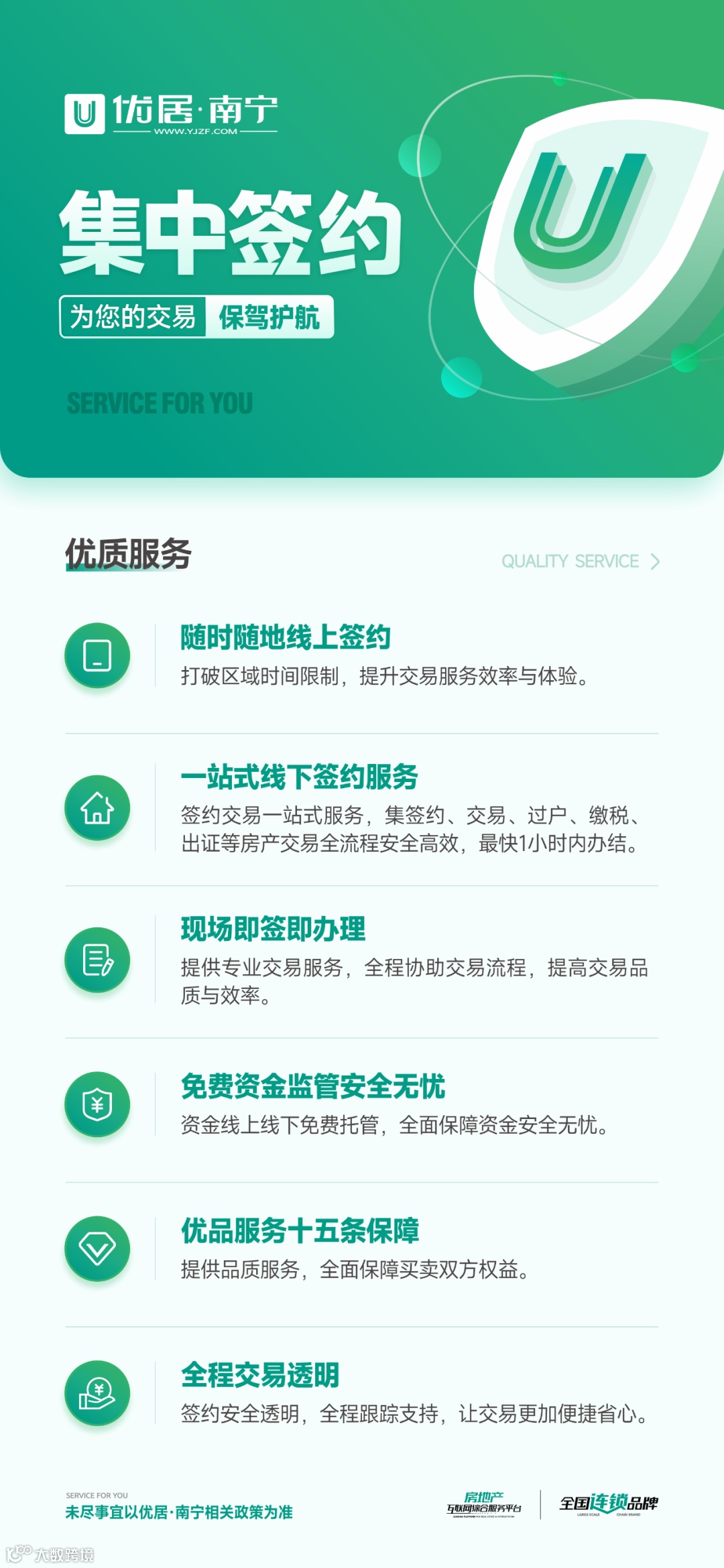 优居·南宁一站式服务中心,在签约前,核查客户权属信息,为客户提供签约咨询、合同签署、线上贷签等多种服务。在签约中,通过标准化流程体系与专业签约经理全程进行合同条款解读,有效保障房产交易安全、提高交易服务效率、改善买卖双方交易体验。