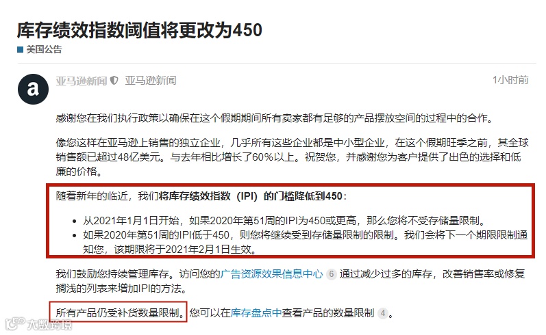 亚马逊的库存绩效分终于从500降到450了,对很多小卖家来说是利好消息,虽然还是存在sku发货数量限制。