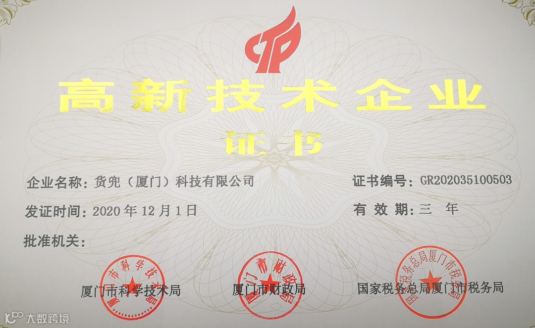2020年12月,货兜喜获佳音,凭借专业的研发队伍,雄厚的技术实力,持续的创新能力,经全国高新技术企业认定管理工作领导小组办公室审批,货兜被认定为国家“高新技术企业”。
