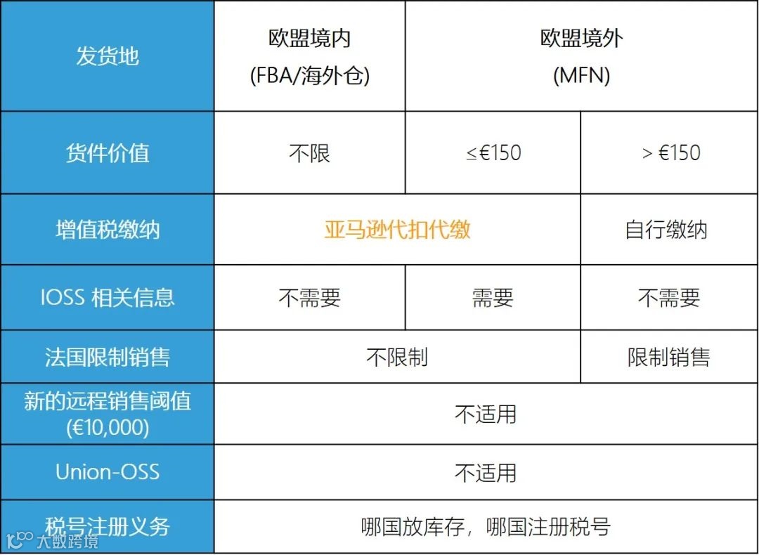 货件价值>€150的商品需要自行缴纳增值税。另外,配送至法国的订单(其他欧盟国家不受影响),货件价值>€150的商品将被限制销售,即7月1日之后买家将无法下单此类商品。