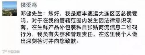 顺丰速运大连区区域总经理侯爱鸣表示:“对于在我的管辖范围内因法律意识淡薄,在生鲜产品外包装私自张贴商流信息二维码,我负有失察和管理责任,在这里我个人做出深刻检讨并向您道歉。”