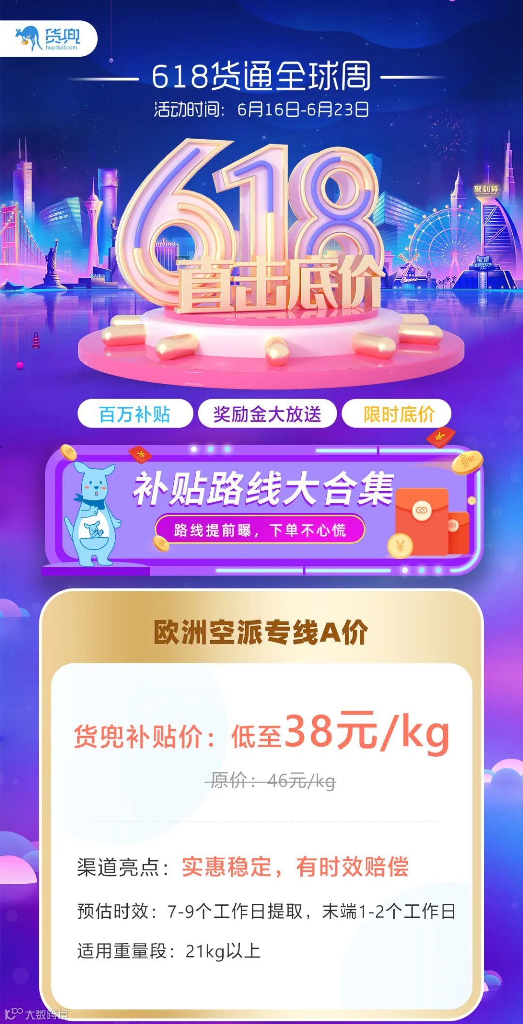 为了助力卖家们货通全球,货兜趁着这次电商618的大热时期,给卖家们带来了超大力度的路线优惠!