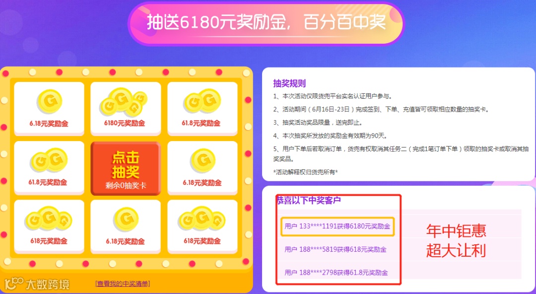 活动期间,只要你上货兜官网,任意下一笔订单,就可以获得一次抽奖机会,最多可以获得8次哦~并且抽到的奖励金是可以立即抵扣运费的,非常实惠。