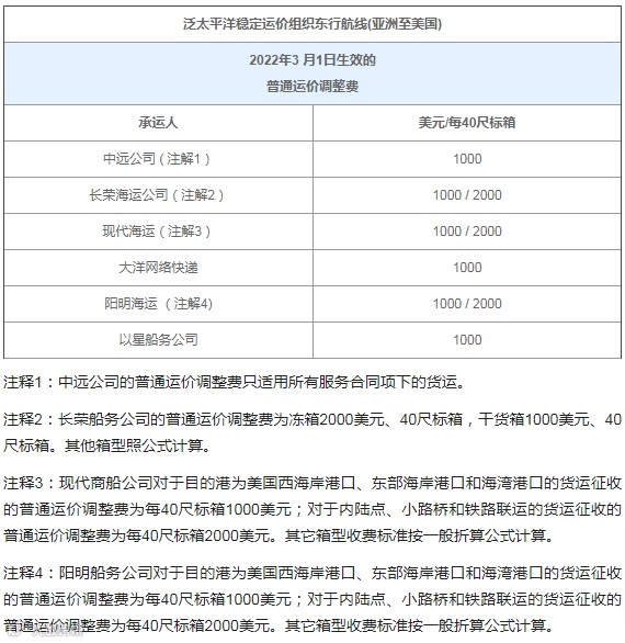 3月1日生效的普通运价调整费