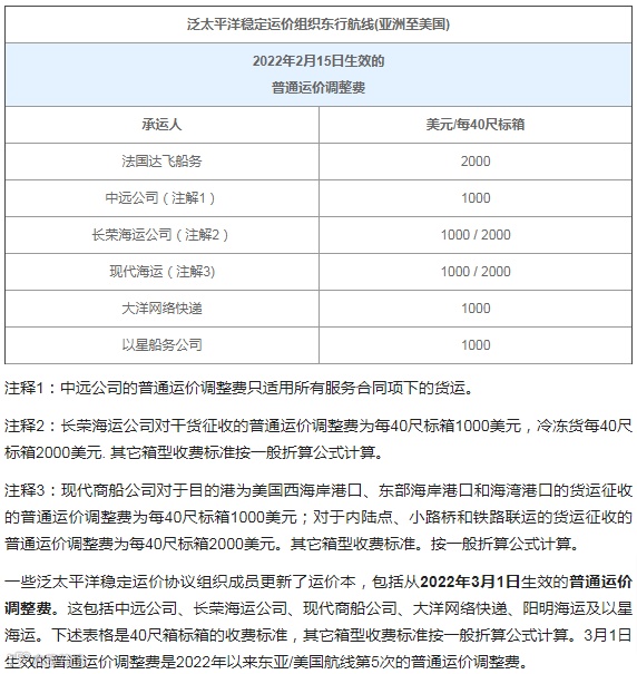2月15日生效的普通运价调整费