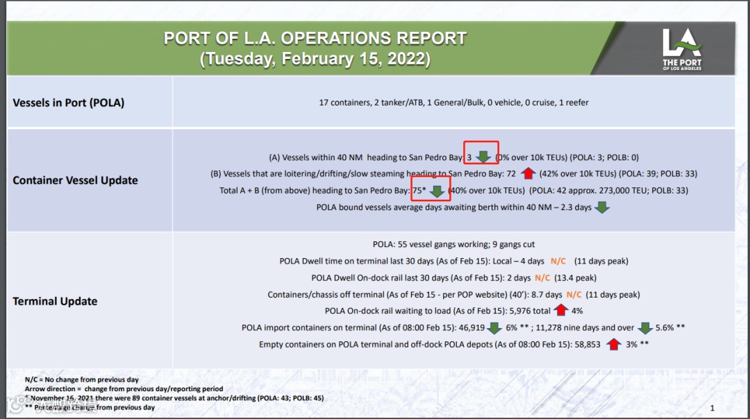据洛杉矶港日报数据表明,2月15日,40海里以内居然只有3艘集装箱船在等待靠泊!虽然在40海里以外还有72艘集装箱在等待,但这已经是这三个月来的最不挤的时候了。