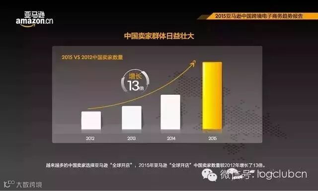 1、中国卖家群体日益壮大:相较2012年,2015年借助亚马逊中国“全球开店”项目走向国际市场的中国卖家数量增长了13倍。