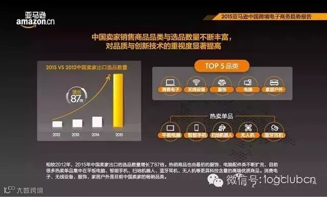 3、中国卖家销售商品品类与选品数量不断丰富,对产品品质与创新技术的重视度显著提高:相较2012年,2015年中国卖家所售选品数量增加了87倍。热销商品也由最初的服饰、电脑配件类不断扩充,目前很多热卖单品集中在平板电脑、智能手机、扫地机器人、蓝牙耳机、无人机等更具科技含量的高端优质商品。消费电子、无线设备、服饰、家居户外是目前中国卖家的畅销品类。