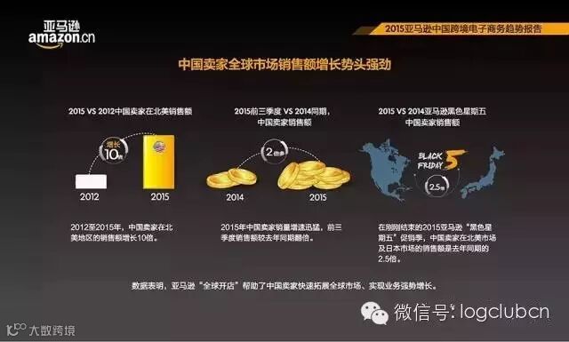 4、中国卖家全球市场销售额增长势头强劲:2012至2015年,中国卖家在北美地区的销售额增长10倍。2015年中国卖家销量增速迅猛,前三季度销售额较去年同期翻倍。在“黑色星期五”促销季中,中国卖家在北美市场及日本市场的销售额是去年同期的2.5倍。