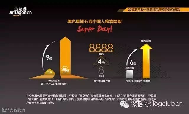 5、黑色星期五成为中国人跨境网购Super Day:在今年“黑五”海外购物节期间,亚马逊“海外购”销售呈井喷式增长,11月27日黑色星期五当日销售额是11.11当日9倍。同时,“黑五”当周“海外购”页面访问量也创历史新高,新增用户量是去年同期4倍。