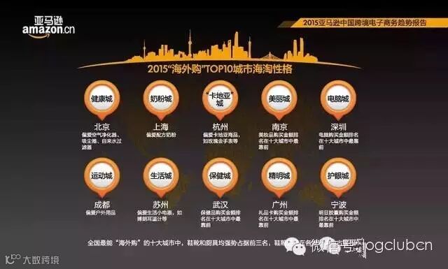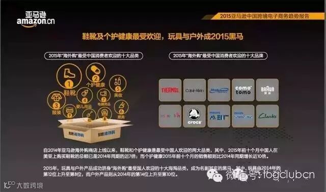 4、鞋靴及个护健康最受欢迎,玩具与户外成为2015黑马:自2014年亚马逊“海外购”上线以来,鞋靴和个护健康是最受中国跨境消费者欢迎的两大品类,其中,2015年前十个月中国人在美亚上购买鞋靴的总额已是2014念同期的近7倍,而个护健康2015年前十个月的销售额则比2014年同期增长近10倍。另外,2015年玩具与户外产品成功跻身“海外购”最受欢迎的十大海淘品类,其中玩具由2014年的第12位上升至第8位,而户外产品则从2014年的第14位上升至第10位。