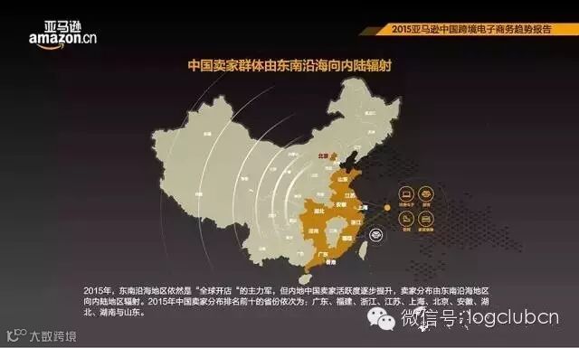 2、中国卖家群体由东南沿海向内陆辐射:2015年,东南沿海地区依然是“全球开店”的主力军,但内地中国卖家的活跃度逐步提升,卖家分布由东南沿海地区向内陆地区辐射。2015年中国卖家分布排名前十的省份依次为:广东、福建、浙江、江苏、上海、北京、安徽、湖北、湖南与山东。